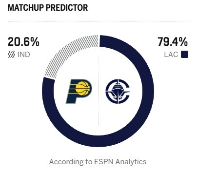 今日ESPN给出本场胜率预测,快船高达79.4%,步行者只有20.6%。